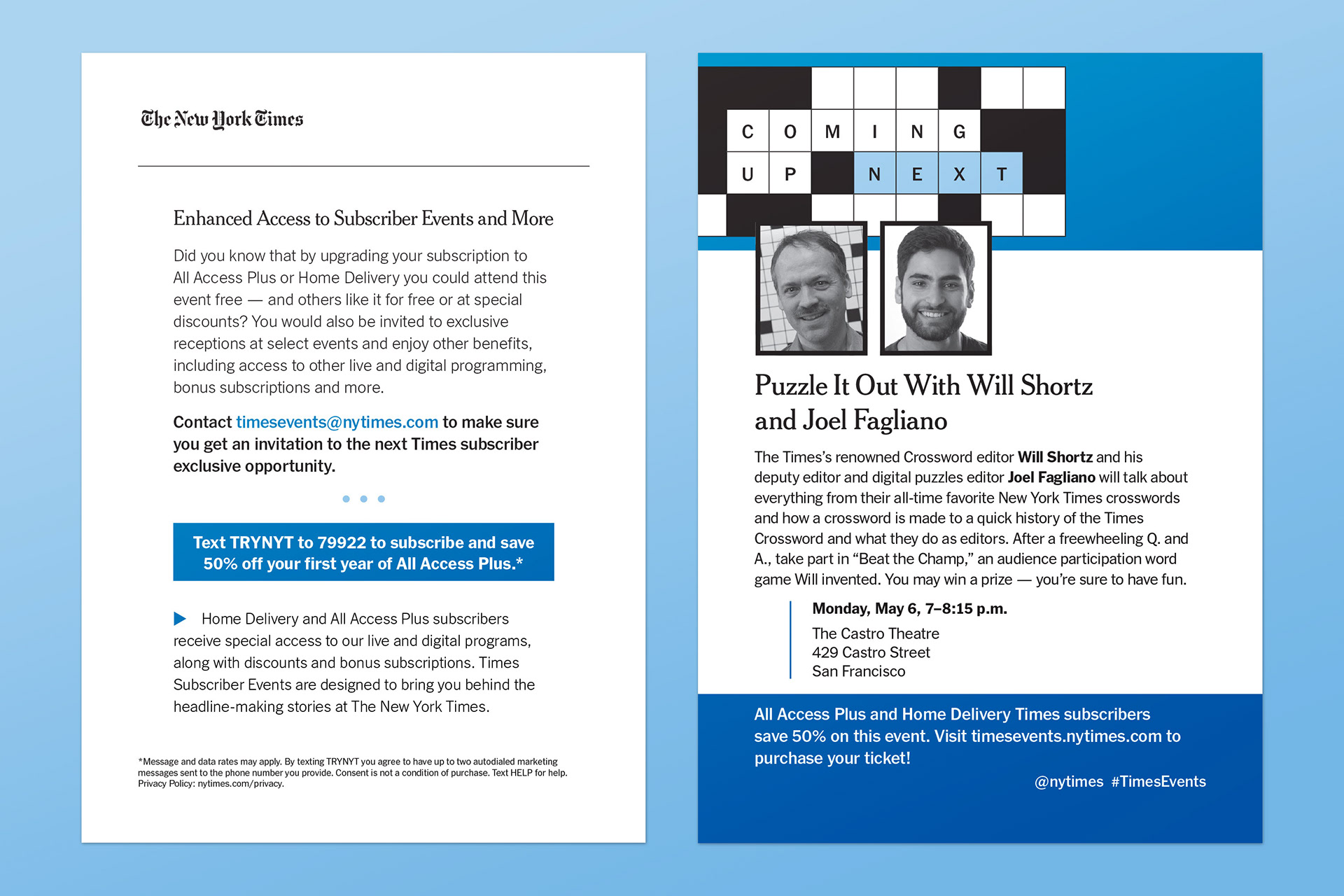 As a freelance designer for The New York Times, I created brochures, postcards, and digital billboards to market various events — from chats with celebrity change-makers to panel discussions featuring renowned Times journalists.